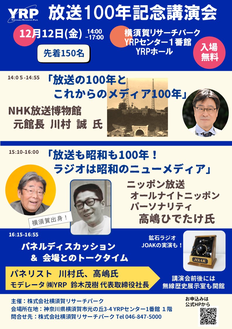 放送技術の礎たる電波・無線技術に特化した研究開発拠点としてスタートした横須賀リサーチパーク(YRP)では、これを記念し、「放送100年記念講演会」を開催いたします。