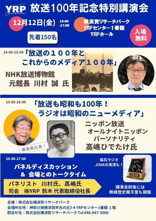放送技術の礎たる電波・無線技術に特化した研究開発拠点としてスタートした横須賀リサーチパーク(YRP)では、これを記念し、「放送100年記念講演会」を開催いたします。