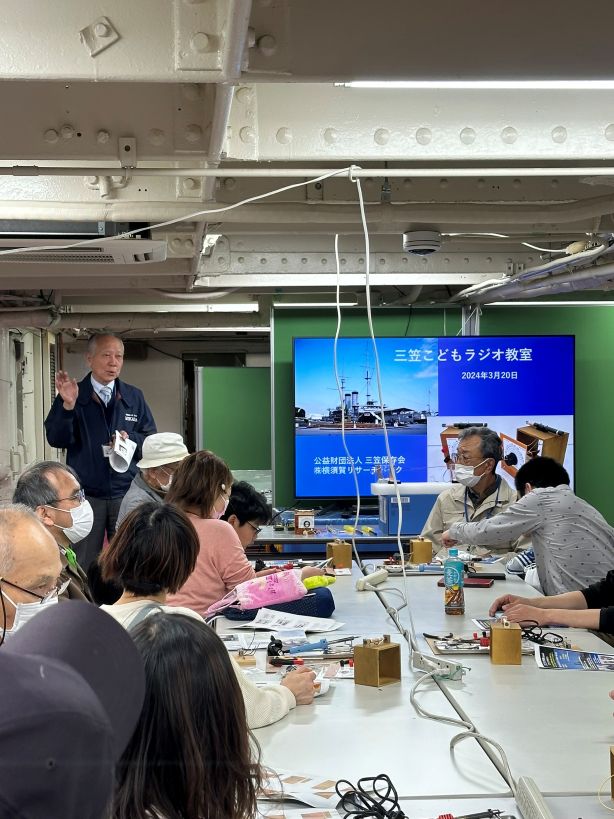 参加者は、工作教室の前に記念艦三笠の内部を見学し、三笠に保存されている明治期の無線機のコヒーラの実験にびっくりされてました。
