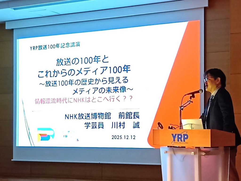 2025年は日本国内での放送の開始から100周年となります。放送技術の礎たる電波・無線技術に特化した研究開発拠点としてスタートした横須賀リサーチパーク(YRP)では、2025年12月12日(金)、これを記念し、「放送100年記念講演会」を開催しました(主催:株式会社横須賀リサーチパーク)。講演会では、この100年間にわたる放送の歩みを振り返るとともに、放送が社会に果たしてきた役割や文化的意義、そしてこれからのテレビ・ラジオの可能性について多角的に考察しました。当日は県内外から163名の方々にご来場いただき、放送の過去・現在・未来について考える、熱気あふれる時間となりました。